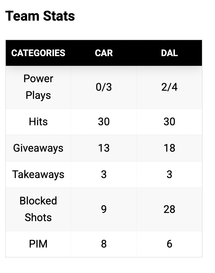 After taking the lead, Dallas blocked shots like mad men. They were down Roope Hintz (more on that in a moment), looked gassed, and were doing their best to hold off the Canes. It felt like the Stars blocked a lot of shots, especially late. So, I looked at the stats real quick…